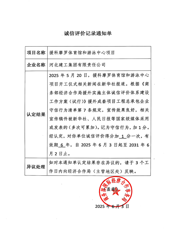 河北建工集團喜獲商務(wù)部誠信評價嘉獎 近日,河北建工集團收到商務(wù)部國際經(jīng)濟合作事務(wù)局《誠信評價記錄通知單》。集團公司因援科摩羅體育館和游泳中心項目開工儀式宣傳效果良好,宣傳稿件被新華社、人民日報等國家級媒體采用或發(fā)表的守信行為,喜獲誠信評...